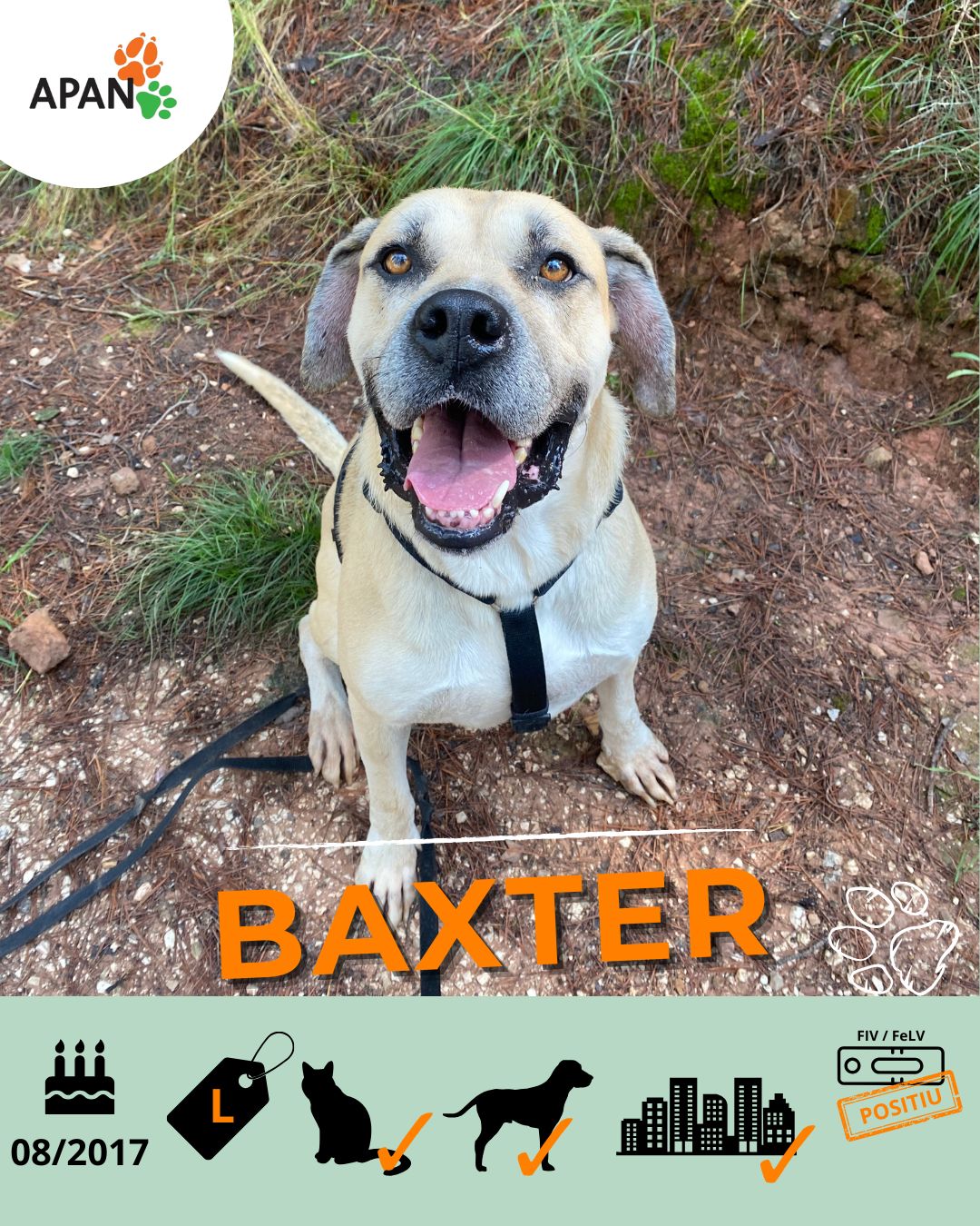 El Baxter és sociable, obedient, respectuós i molt carinyós. Al refugi espera pacientment a la seva gàbia que algú s’acosti a fer-li carícies. Quan el mires, se li desfà el cos: la cua comença a moure’s amb una alegria que no li cap dins.