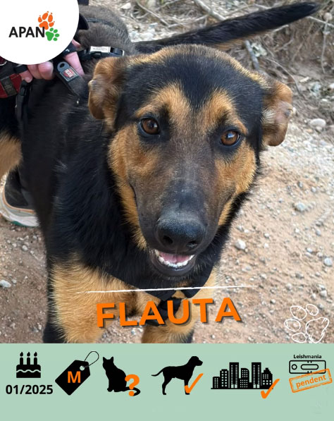 La Flauta és una gosseta molt jove, d’aproximadament un any, amb una energia desbordant i moltes ganes de descobrir el món. Creiem que és un encreuament de pastor alemany i border collie, i sembla haver heretat el millor de totes dues races: és obedient i lleial com un pastor alemany, inquieta i molt visual com un border collie. I la intel·ligència? Ha sumat la de totes dues.
