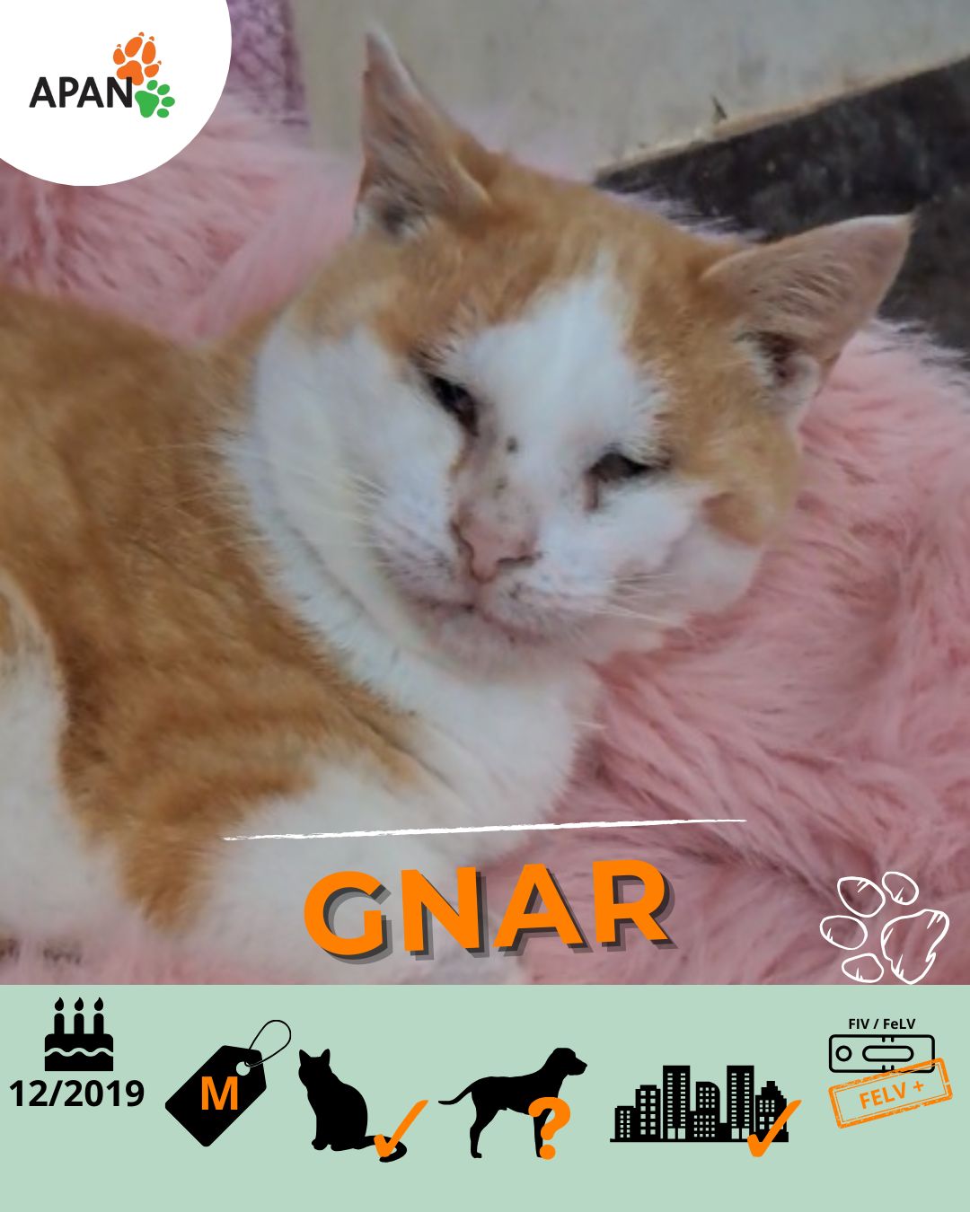 Gnar no ha tingut una vida fàcil, però si el veiessis dormint tan panxo, diries que ha descobert el secret de la felicitat felina. És un gat adult, positiu a FeLV, que necessita amb urgència una família que li ofereixi allò que mai ha tingut de veritat: estabilitat, calma i un sofà digne del seu nivell professional de descans. Idealment hauria de conviure amb gats també positius o ser fill únic —no perquè sigui antipàtic, sinó perquè la seva salut ho requereix.